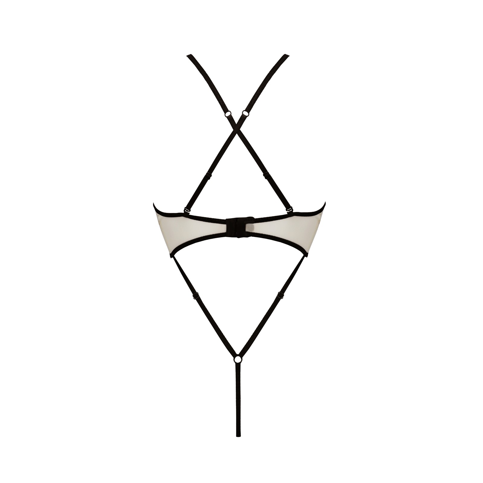 El escote, con un diseño original y atrevido, y la espalda al descubierto dan a la prenda un toque de atrevimiento. La abertura en la zona de la entrepierna confiere al conjunto una personalidad única.