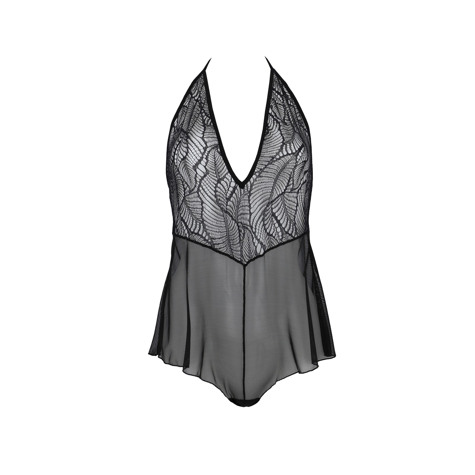 Confeccionado en suave tul negro combinado con delicado encaje, realza el cuerpo de forma sutil y seductora, dejando una impresión inolvidable.