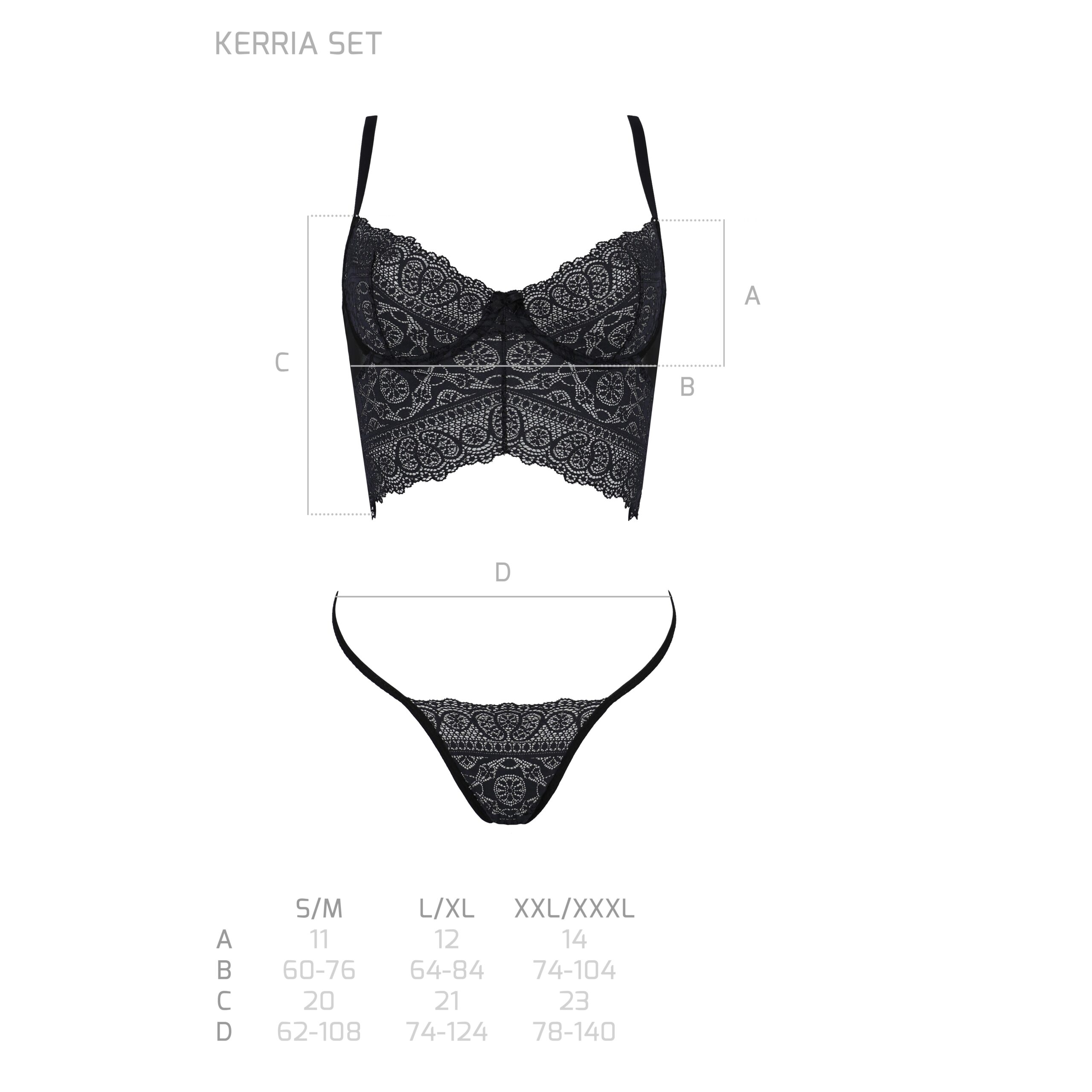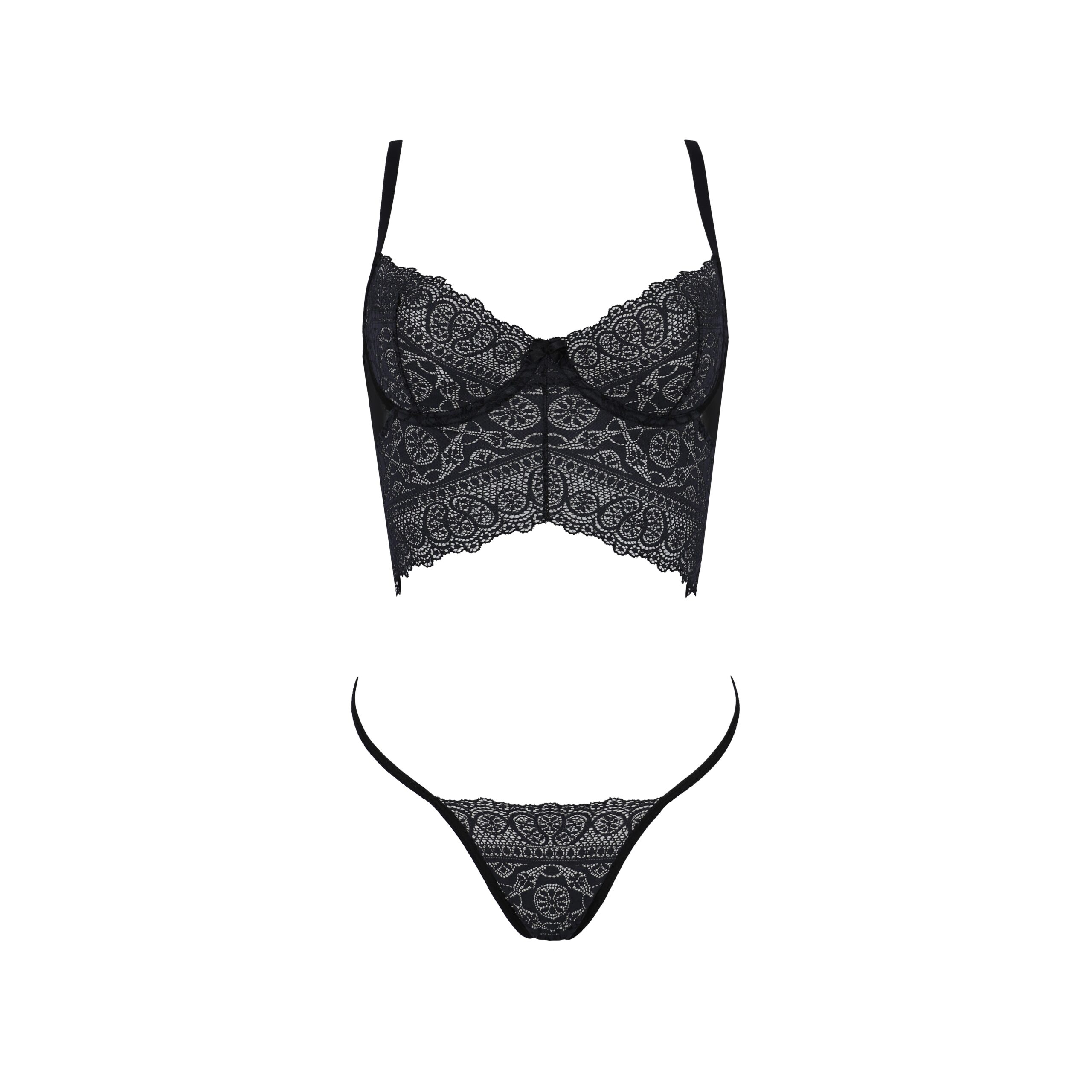 Fabricado en material negro de alta calidad, el conjunto destaca por su corte inusual y la delicadeza del femenino encaje que decora tanto el sujetador como el tanga.