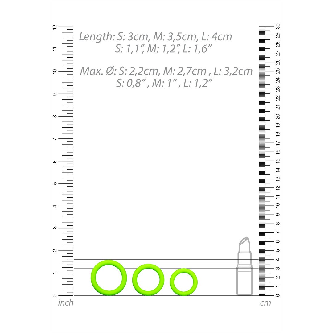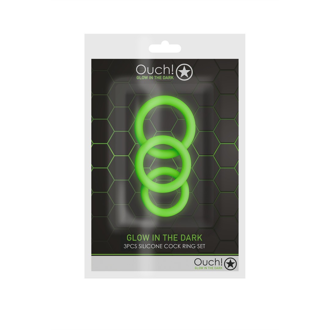 Con Ouch! Glow in the Dark, la diversión no hace más que empezar cuando se apagan las luces. Este conjunto de anillos para el pene contiene anillos de tres tamaños que son cómodos y elásticos.