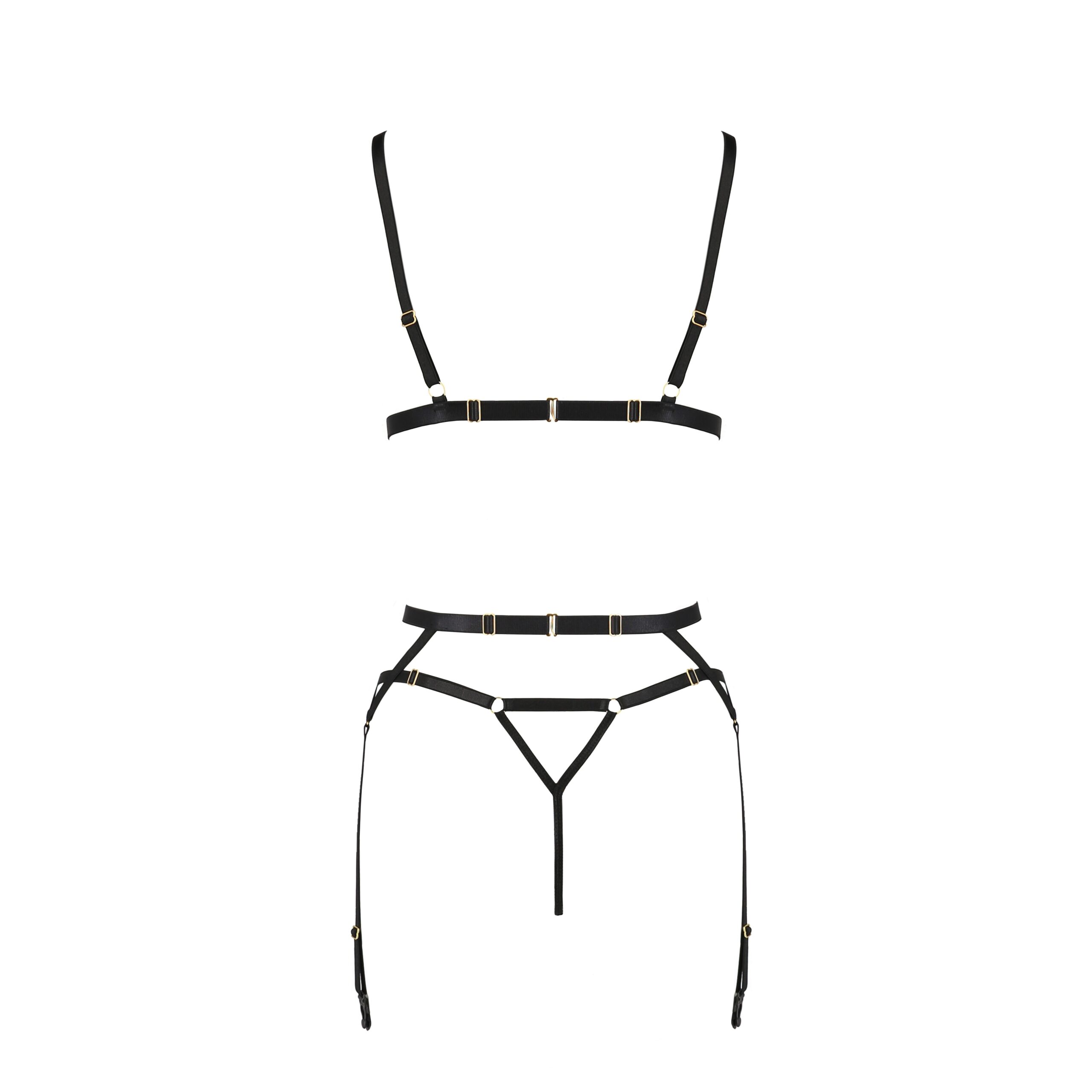 El conjunto Meggy combina sensualidad y sofisticación con un sujetador, un tanga y un liguero. El diseño artístico realza tus curvas, mientras que los versátiles tirantes te permiten llevarlo completo o por separado, lo que lo hace perfecto para cualquier ocasión.