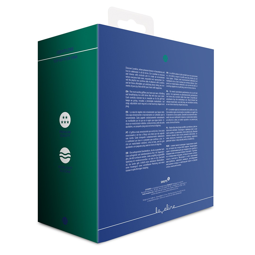 Incluye un masturbador elástico, una correa para el pene, un anillo para el pene ajustable y un pequeño plug anal en forma de lágrima.