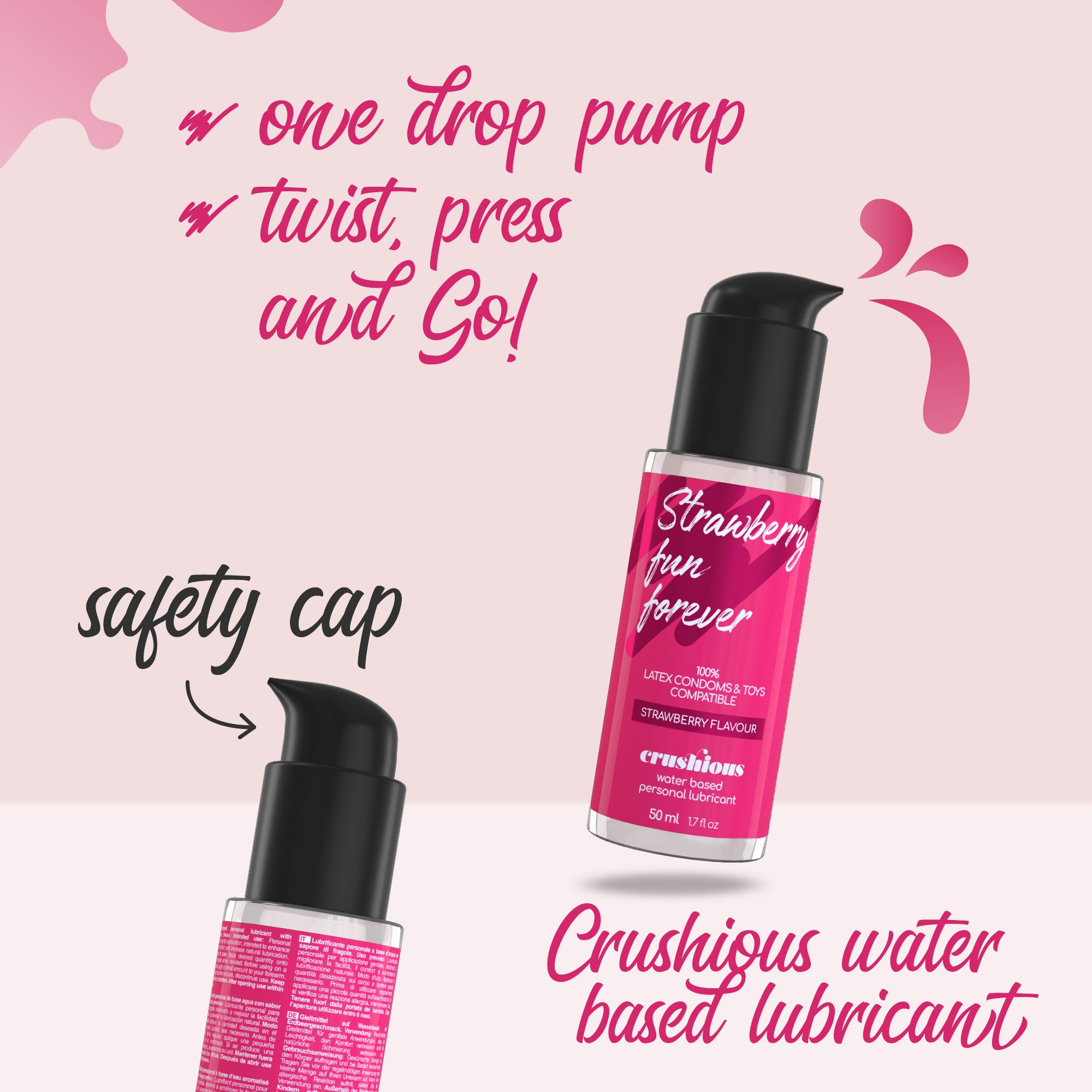 El lubricante Crushious con aroma y sabor de fresa es 100% Besable. Es el aliado perfecto para el sexo oral y también puede ser usado en la penetración. Bajo contenido de azúcar.