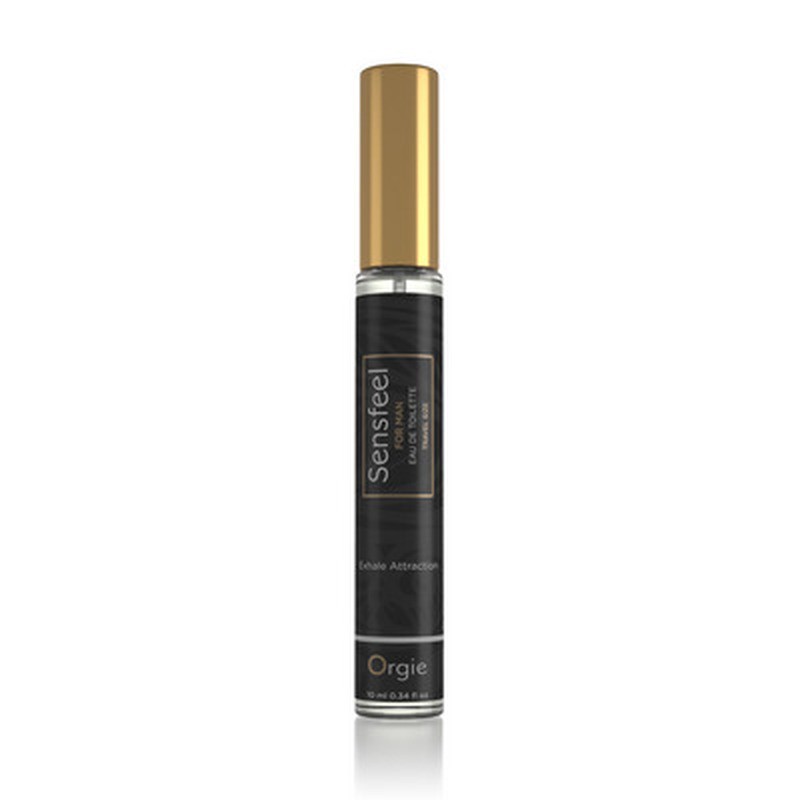 Perfume de viaje de 10 ml Sensfeel for Man, fórmula exclusiva de Orgie con el ingrediente activo de origen natural Sensfeel for Him™, un potenciador de feromonas que puede aumentar el atractivo de los hombres gracias a la acción simultánea de dos de sus componentes: La forskolina, que aumenta la expresión de la enzima 3 beta-HSD, lo que incrementa la producción de la feromona sexual masculina, la androstadienona, y las teaflavinas, que disminuyen la actividad de la enzima 5-alfa reductasa, reduciendo el metabolismo de la androstadienona y provocando su acumulación.