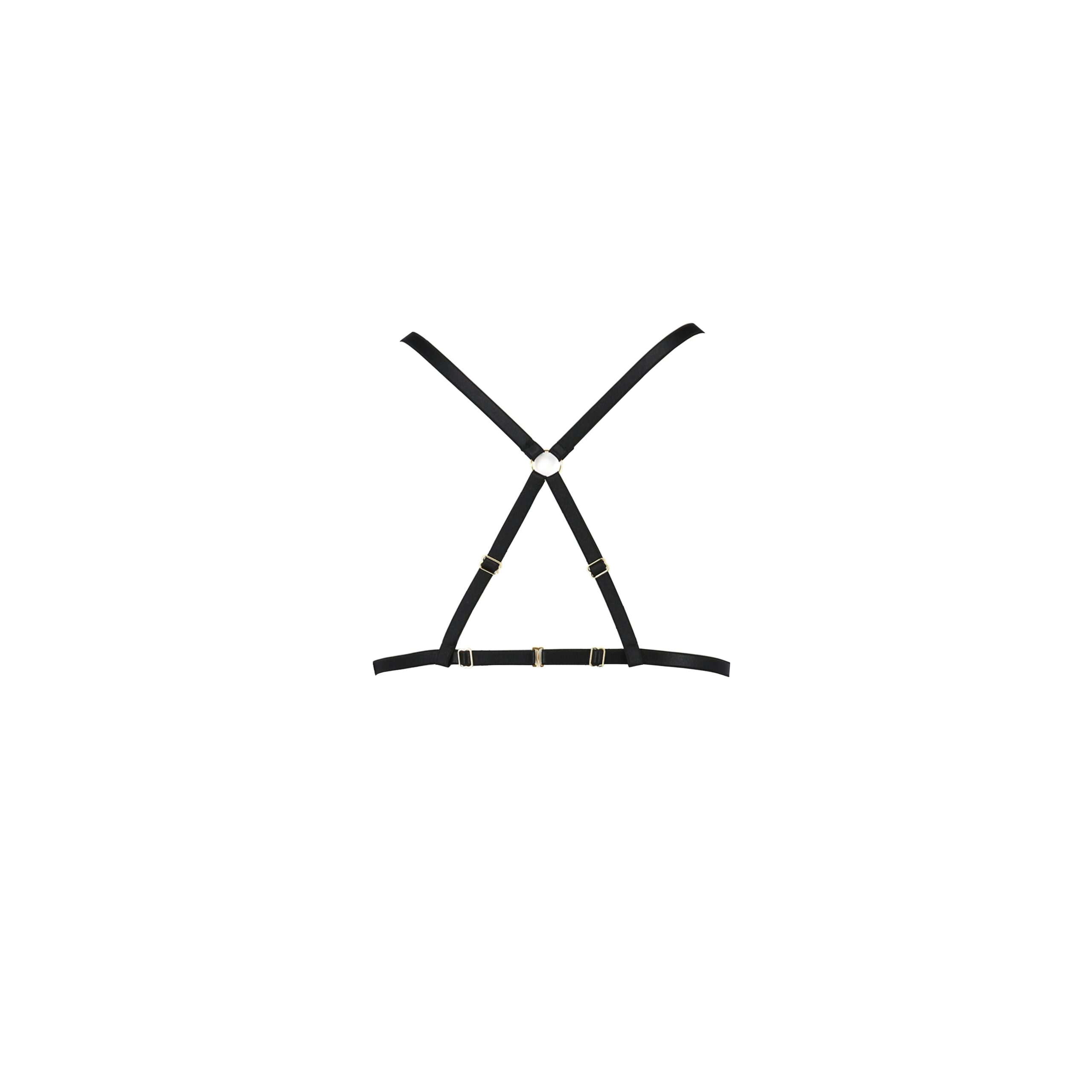 El sujetador abierto está creado con tirantes finos y delicados que contornean el busto, ajustándose perfectamente gracias a los botones de ajuste.